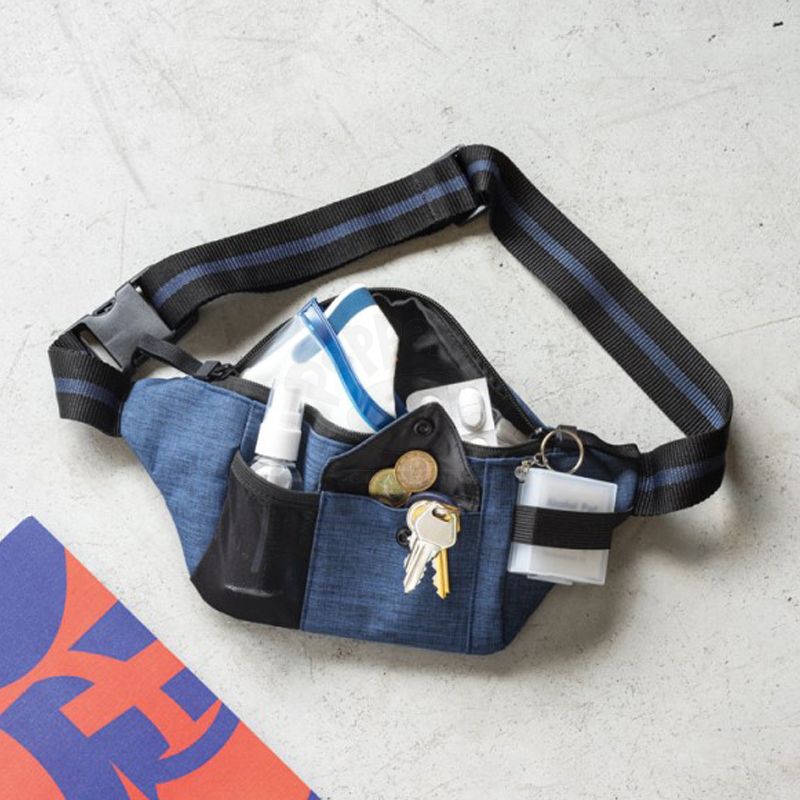 Pochete de cintura personalizada produzida em ripstop 300D de alta densidade. Possui compartimento principal com fecho, bolso interior em rede elástica, bolso na parte posterior de fácil acesso ideal para guardar os bens com maior segurança, parte frontal com bolso em rede elástica, um bolso com pala, botão para fecho e um elástico na lateral indicado para pendurar mosquetões ou óculos de sol. A alça é ajustável em webbing com fecho. Ideal para brindes promocionais e eventos corporativos.