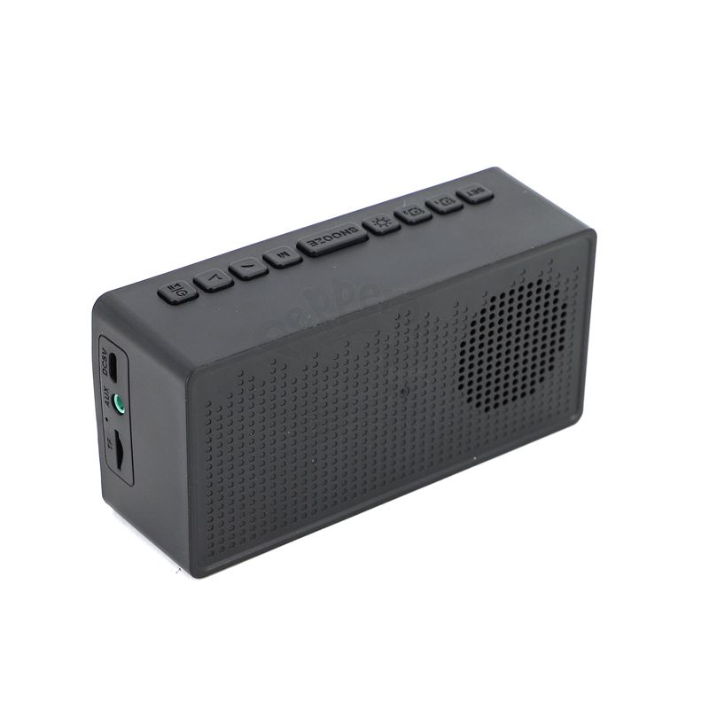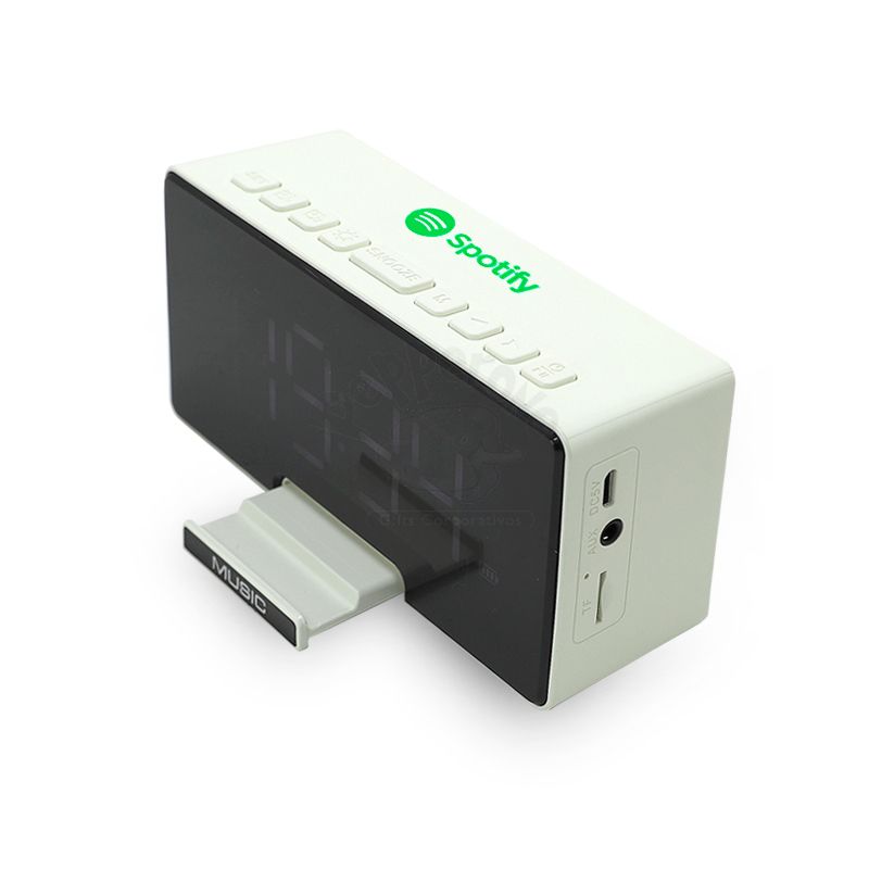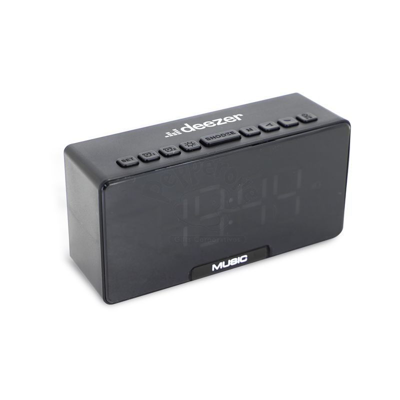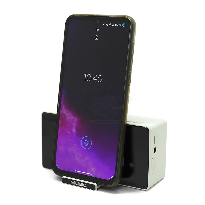 Caixa de som multimídia bluetooth com relógio despertador e suporte para celular. Produzida em plástico e com borrachas antiderrapantes na área inferior, a caixa de som tem a área frontal com display de LED, além de um compartimento com suporte para celular – uma espécie de “gaveta” aonde é exibido (MUSIC), basta puxá-la ter acesso ao compartimento. A caixa de som executa nos modos bluetooth, rádio FM, cartão TF-microSD e entrada auxiliar P2. Acompanha cabo USB e manual em inglês. Imagem ilustrativa.
