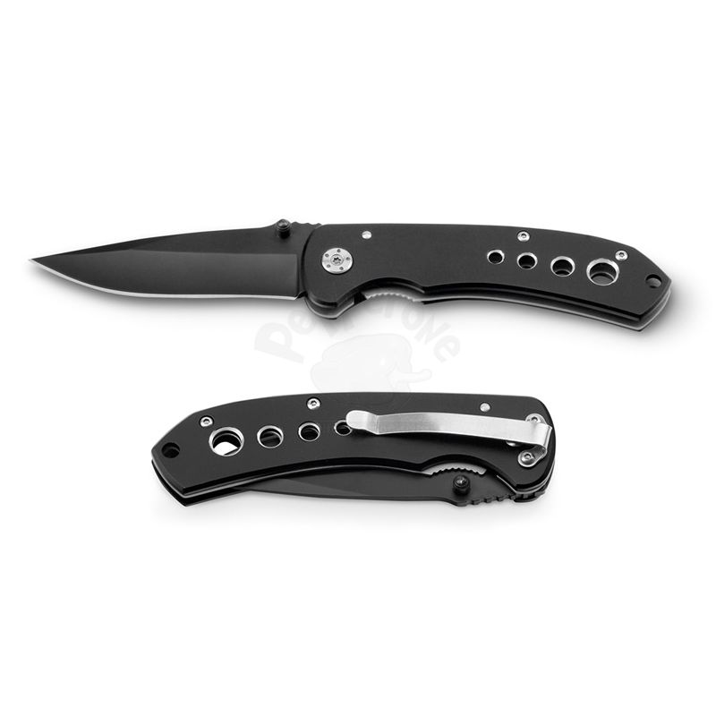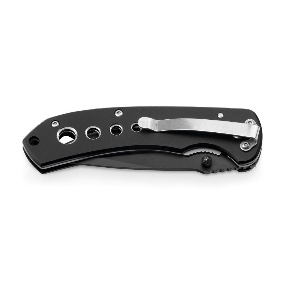 Canivete de metal personalizado produzido em aço inox com detalhes diferenciados. Possui fecho de segurança e clipe para bolso. Ideal para pesca, camping e esportes de aventura.