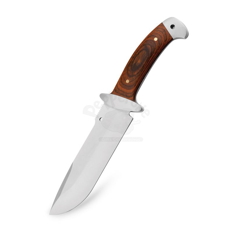 Faca de metal personalizada produzido em aço inox com detalhes em madeira. Possui bolsa em nylon 600D com trava de segurança para facilitar o transporte, empunhadura anatômica, parte superior da lâmina com alguns sulcos que além de darem um detalhe especial à peça também podem ser utilizados como escamador. e lâmina em aço 440. Ideal para pesca, camping e esportes de aventura.