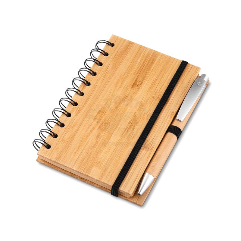 Bloco de anotações personalizado produzido em bambu com capa dura. Possui elástico para fechamento, wire-o de metal, caneta esferográfica em bambu com acionamento por clik e 60 folhas pautadas de papel reciclado. Ideal para divulgar sua empresa em eventos corporativos, brindes personalizados e campanhas promocionais.