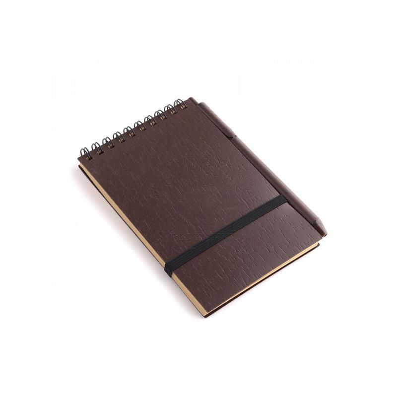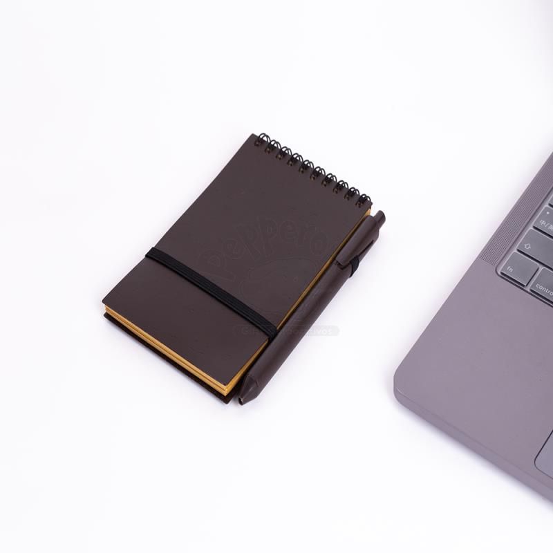 Bloco de anotações personalizado produzido em material antibacteriano com capa em PP (polipropileno) café com wire-o. Possui suporte para 1 caneta plástica retrátil café, miolo com 60 folhas sem pautas e elástico para fechamento da capa. Ideal para brindes promocionais e eventos corporativos. Imagem ilustrativa.