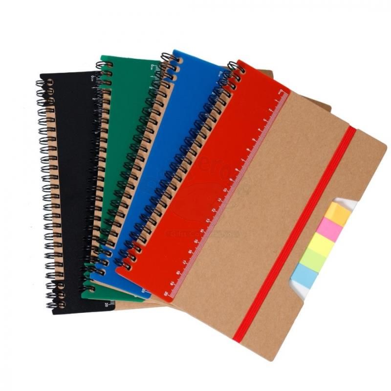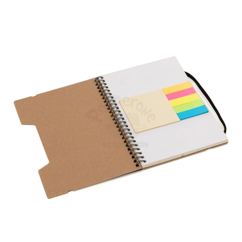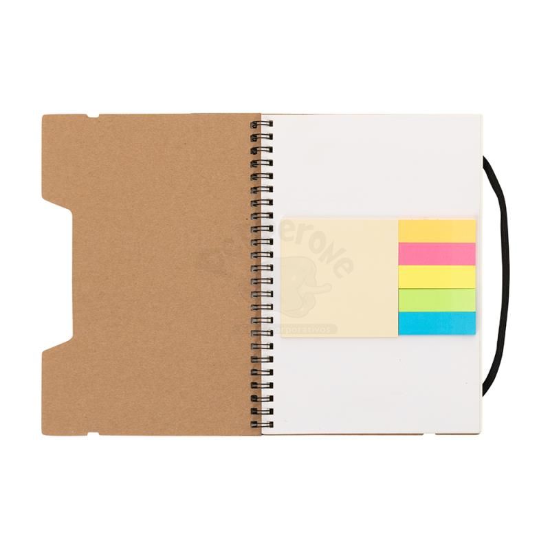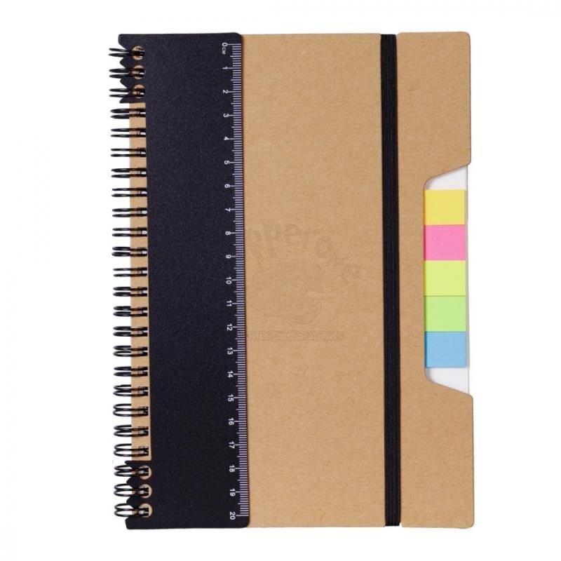 Bloco de anotações personalizado produzido com capa em papel kraft. Possui régua destacável de 20cm, Miolo de 70 folhas pautadas bege, 5 Sticky notes coloridos de 25 folhas,1 Bloco de anotações 7,5cm x 7,5cm com 25 folhas, elástico de fechamento e wireo de metal. Imagens ilustrativas.
