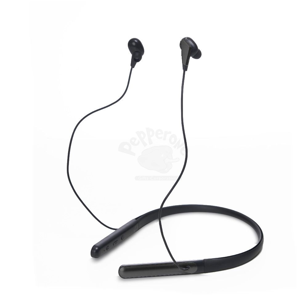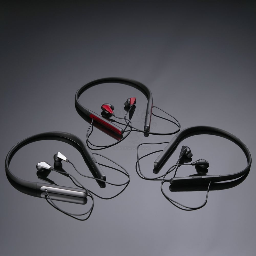 Fone de ouvido bluetooth com haste para pescoço. Possui microfone para atendimento de chamadas telefônicas, botões liga/desliga, função volume + –, e haste com entrada para carregamento micro USB, acompanha USB paca carregamento. Ideal para brindes promocionais e eventos corporativos. Imagem ilustrativa.
