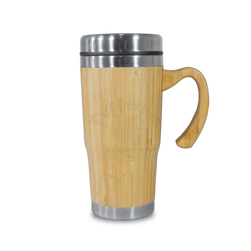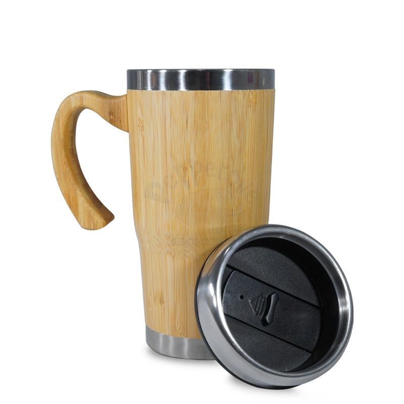 Caneca personalizada com capacidade para 500ml, possui corpo revestido em bambu, alça de bambu e parte interna em inox. Possui tampa rosqueável com compartimento retrátil. Ideal para brindes promocionais e eventos corporativos.