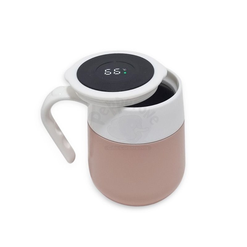 Caneca térmica personalizada produzida em inox com capacidade para 500ml, Possui display LED com termômetro digital na tampa para indicar a temperatura do líquido e tampa rosqueável com anel de vedação. Ideal para brindes promocionais e eventos corporativos.