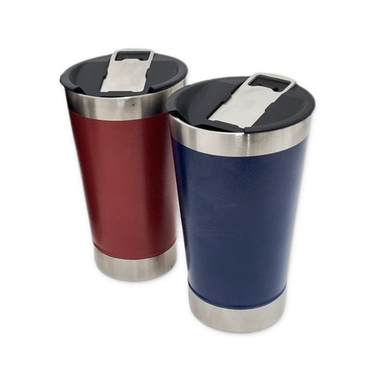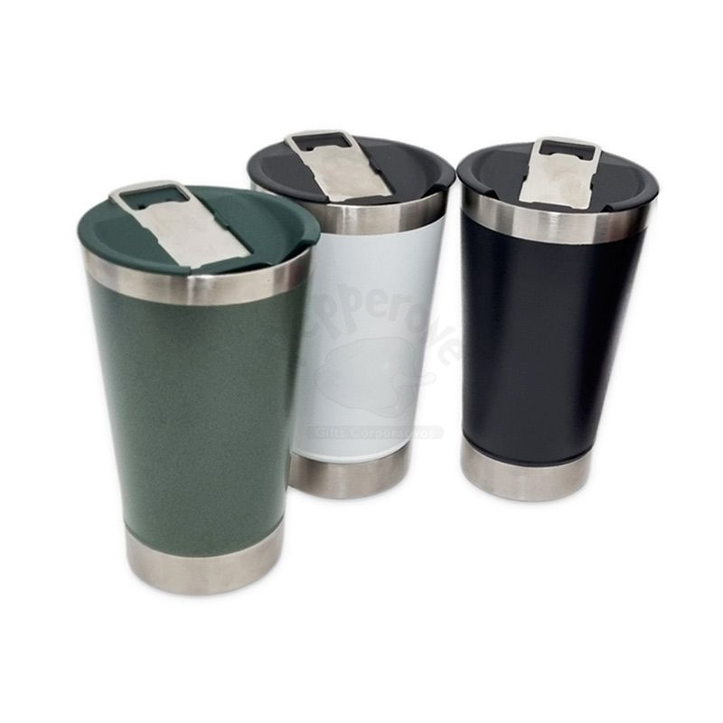 Copo térmico personalizado produzido em Inox com capacidade para 500ml, possui tampa removível e abridor em inox acoplado. Material livre de BPA. Ideal para brindes promocionais e eventos corporativos.