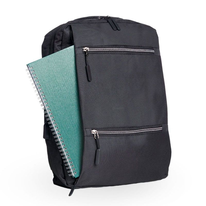 Mochila confeccionada em nylon com compartimento para notebook até 15,6 polegadas. Contém compartimento grande com divisórias para documentos, eletrônicos e caneta, dois compartimentos frontais com abertura horizontal, bolso lateral e adaptador USB externo com cabo acoplado, permitindo a conexão de um carregador portátil de dentro da mochila e transferência da carga para o lado externo, ocultando o carregador e viabilizando a utilização do celular durante o processo. Contém zíperes com pegadores plásticos, alça de mão em nylon, alças para as costas ajustáveis com revestimento espumado antitranspirante e alça horizontal para encaixe em malas de viagem. Ideal para brindes promocionais e eventos corporativos. Imagem ilustrativa.
