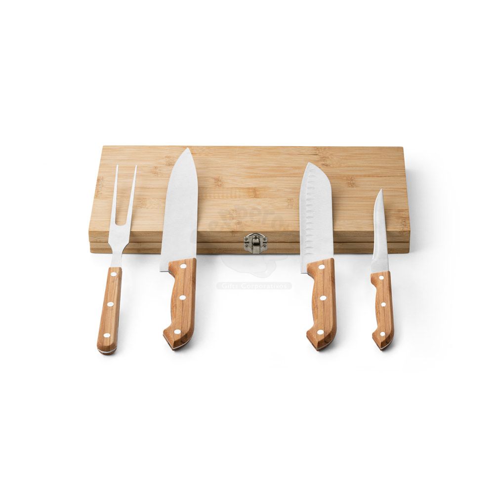 Kit churrasco personalizado com em estojo de bambu. Composto por 4 utensílios em aço inox e bambu: faca japonesa, faca chefe, faca boning e garfo. Próprio para cortes de alimento e carnes em geral. Ideal para brindes promocionais e eventos corporativos.