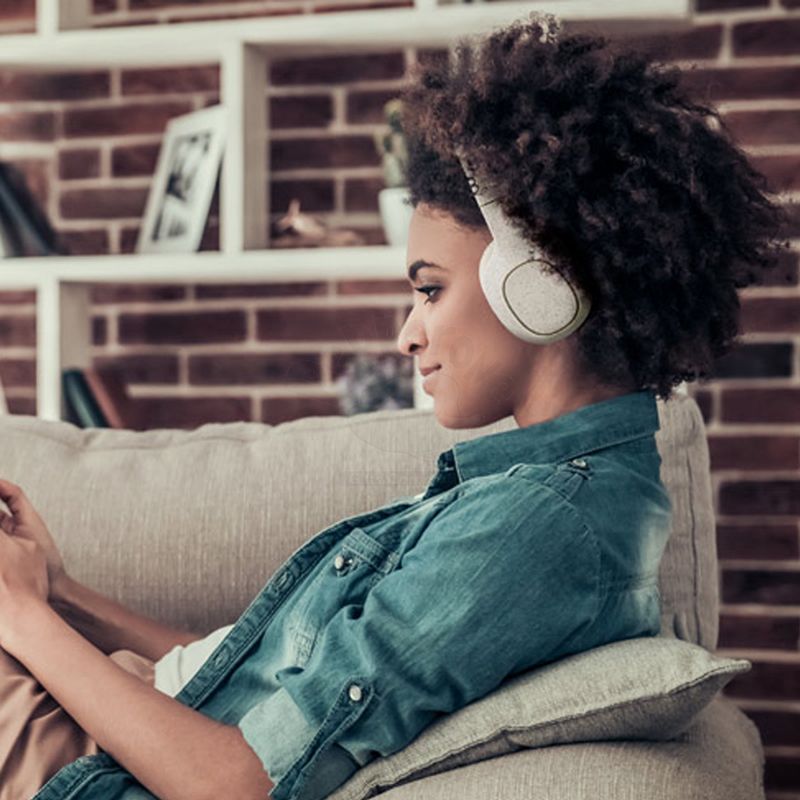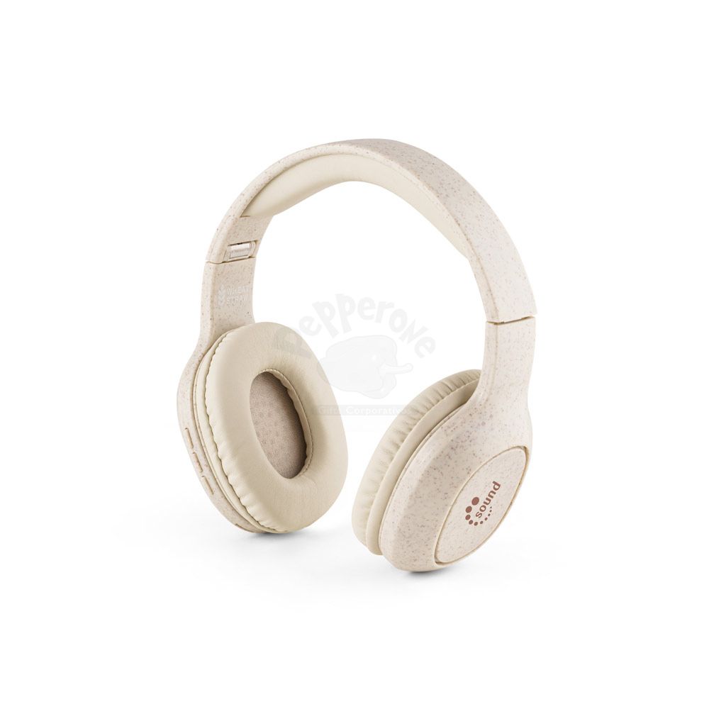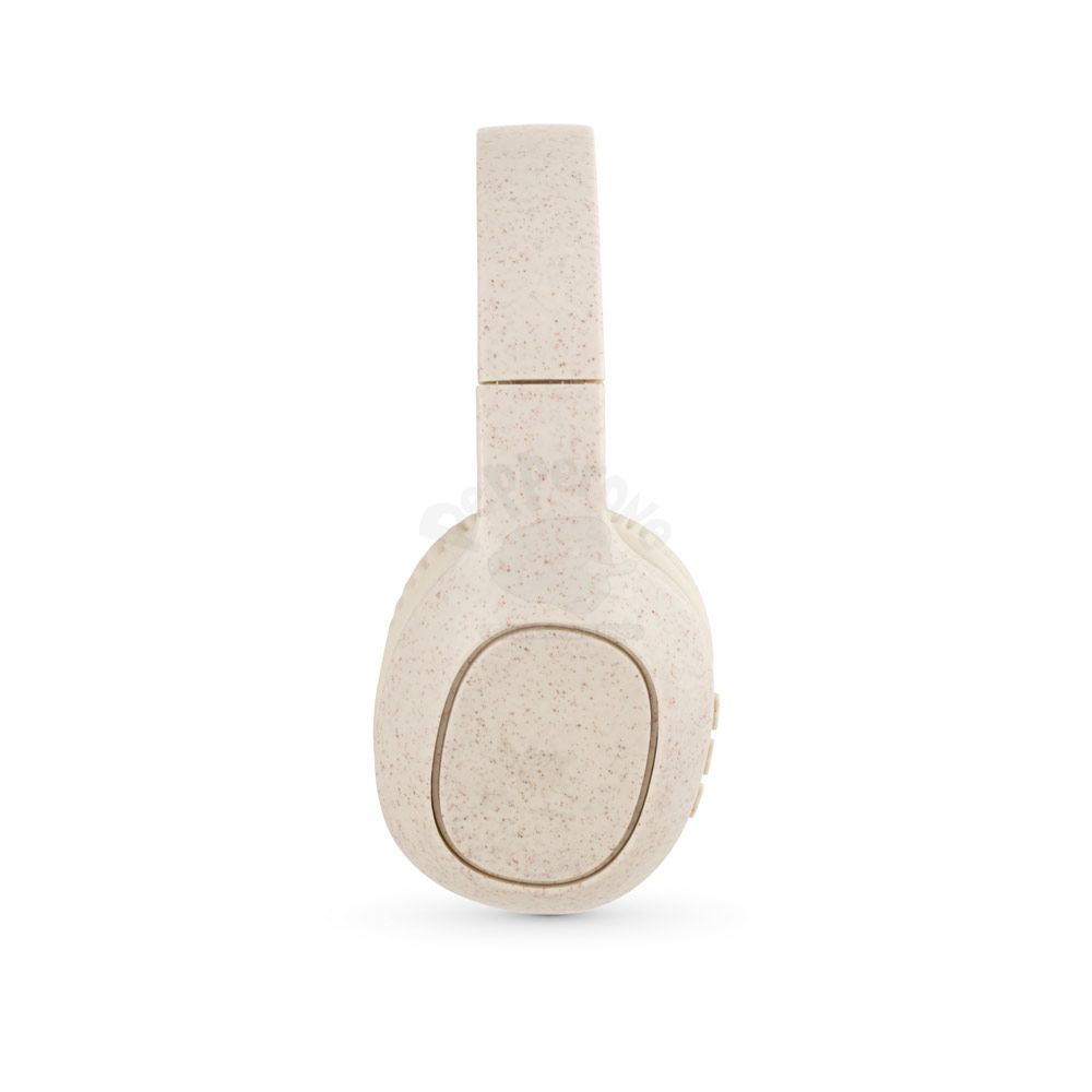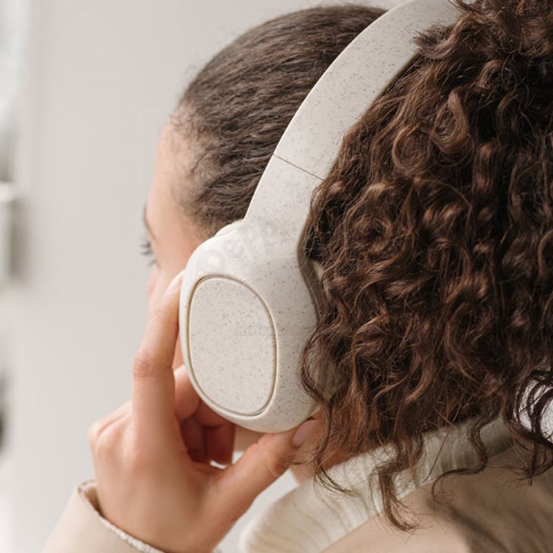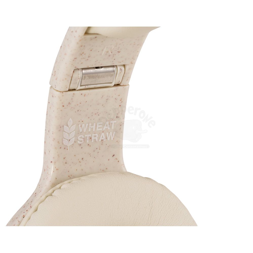 Fone de ouvido bluetooth personalizado produzido em fibra de palha de trigo e ABS. Potência de 32mW e transmissão bluetooth 5.0 com alcance até 10m. Bateria com capacidade de 400mAh e tempo de reprodução até 13 horas. Incluso porta AUX, slot para cartão TF/SD e cabo de carregamento micro USB. Botões de controle com +/- e ligar/desligar. Imagem ilustrativa.