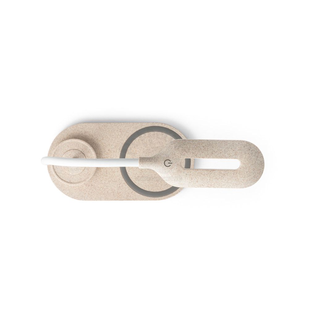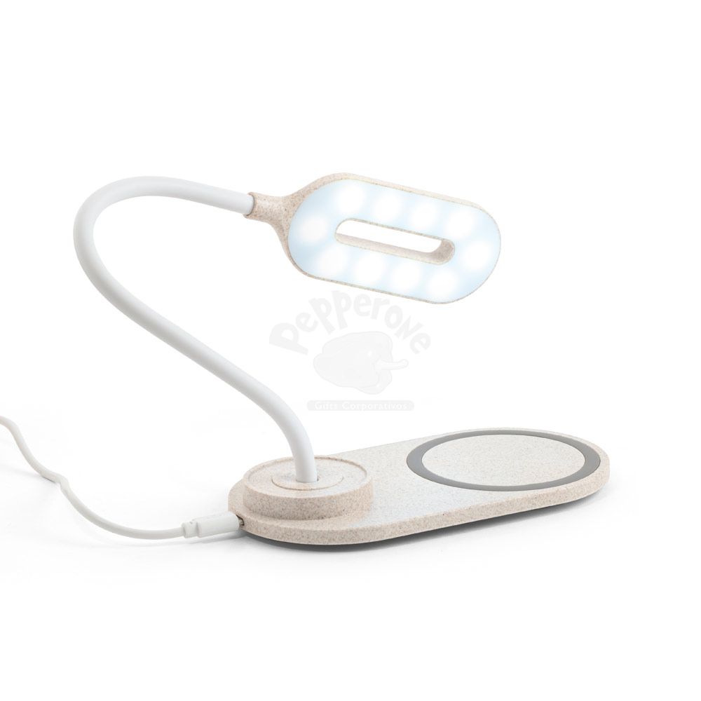 Luminária LED de mesa em ABS e fibra de palha de trigo com carregador wireless. A haste é flexível para ajustar a direção da luz e contém 20 LEDs que permitem uma iluminação até 3 níveis de intensidade. No topo da luminária encontra-se um botão touch para ligar, desligar e ajustar os níveis de iluminação. O carregador sem fios é de carregamento rápido, tendo uma potência até 10W, com entradas 5V/2A e 9V/1.67A. No local onde o equipamento é colocado tem um círculo com silicone para evitar que se mova. Incluso cabo micro USB de 1 m. Ideal para brindes promocionais e eventos corporativos. Imagem ilustrativa.