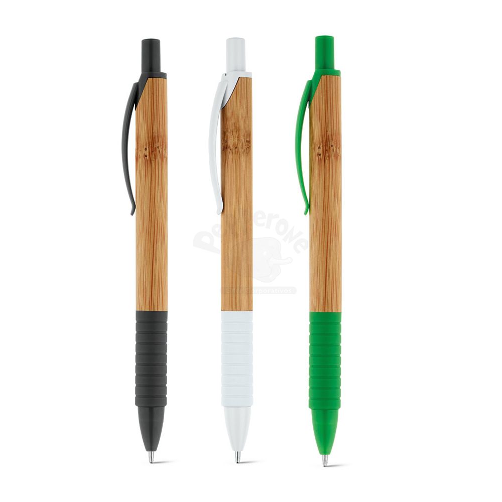 Esferográfica em bambu com antideslizante e com clipe e ponteira de plástico.