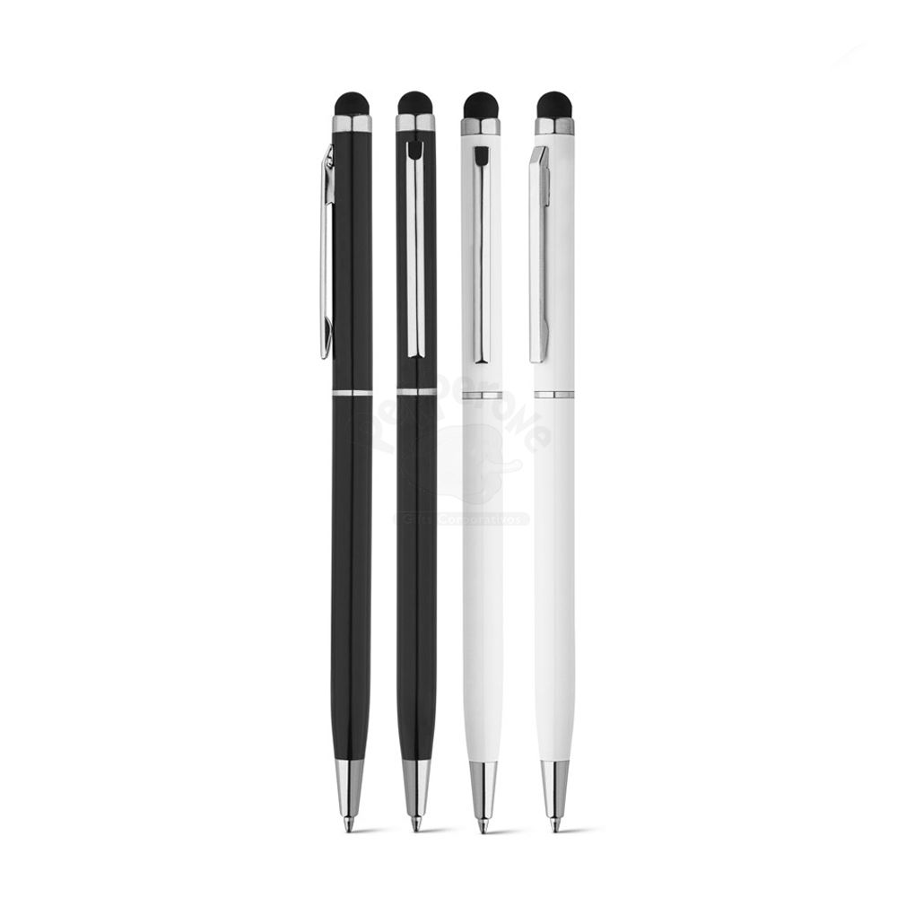 Esferográfica em alumínio com tratamento antibacteriano, segundo a certificação ISO22196. Mecanismo twist, clipe e ponteira touch.