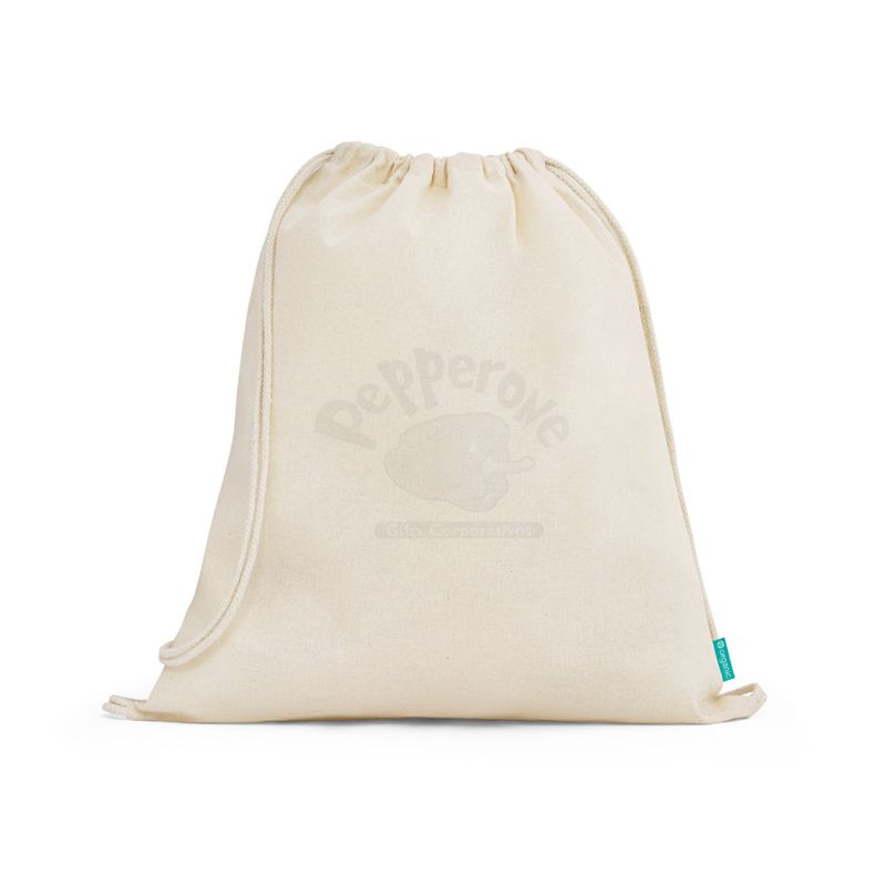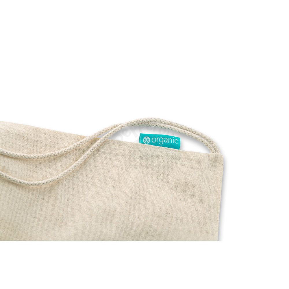 Mochila saco ecológica personalizada produzida em 100% algodão orgânico (120 g/m²) proveniente de um cultivo sustentável sem químicos ou pesticidas. Possui amplo espaço, alças de 60 cm e etiqueta Label Organic lateral. Ideal para brindes promocionais e eventos corporativos. Imagem ilustrativa.