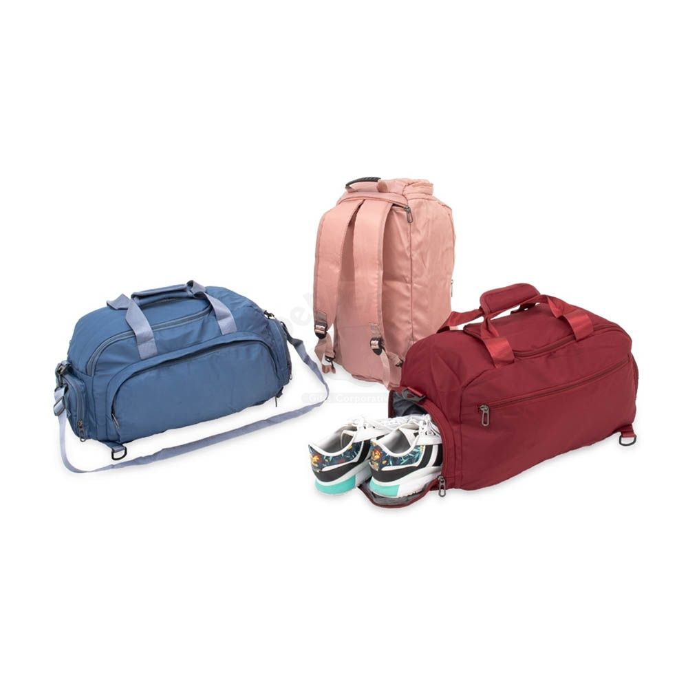 Bolsa esportiva de 28 litros em poliéster resistente à água com cinco compartimentos, sendo três deles exclusivos para tênis, itens molhados e armazenamento das alças de costas .