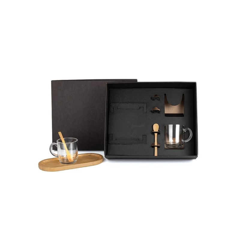 Kit café 5 peças. Esse kit conta com duas canecas em vidro, duas colheres e bandeja em Bambu com dimensões 26x12x1,7cm. Perfeito para sua campanha de endomarketing e/ou premiação de colaboradores.