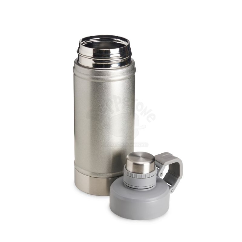 Garrafa térmica de parede dupla em inox, capacidade de 500ml. Tampa principal com bocal e tampa protetora com alça de transporte acoplada.