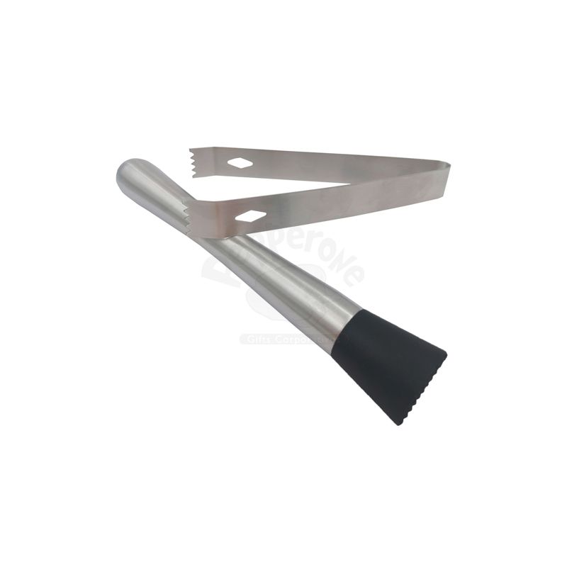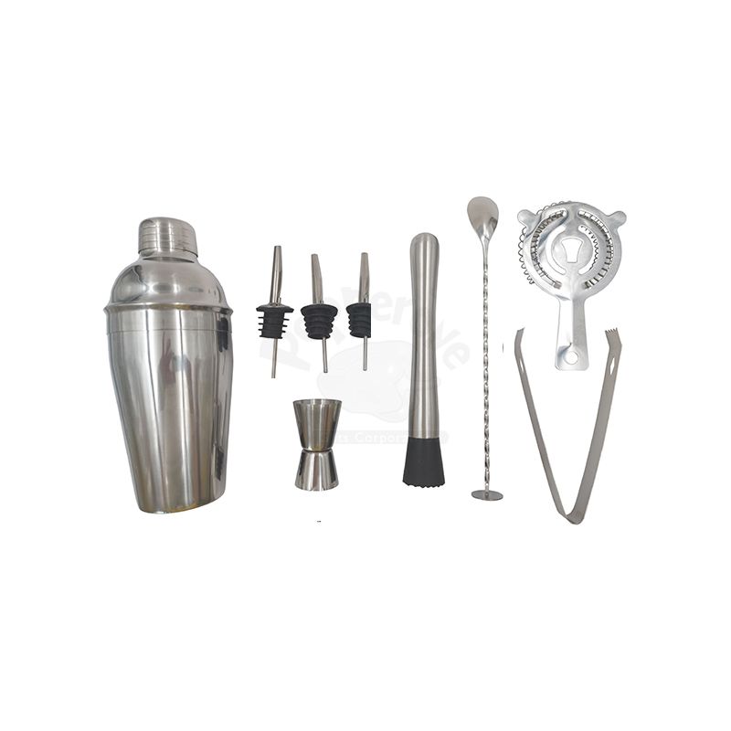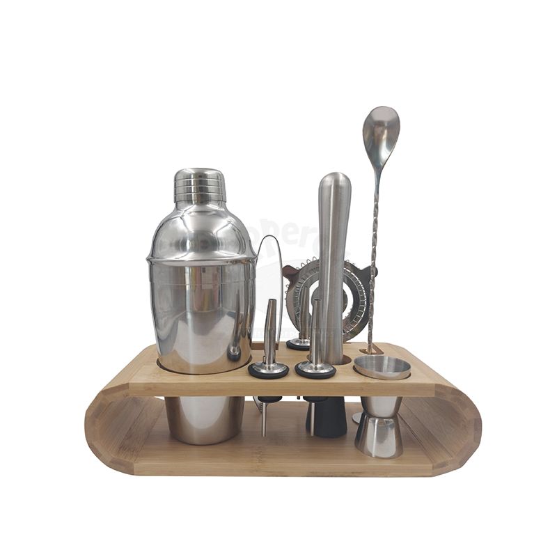 Kit coqueteleira personalizado, material em inox com detalhes em borracha, possui três dosadores, um socador, colher bailarina, pegador de gelo, suporte de madeira, mini copo dosador duplo de medidas e coqueteleira de 550ml com tampa e filtro. Ideal para sua campanha de endomarketing ou premiação de colaboradores.