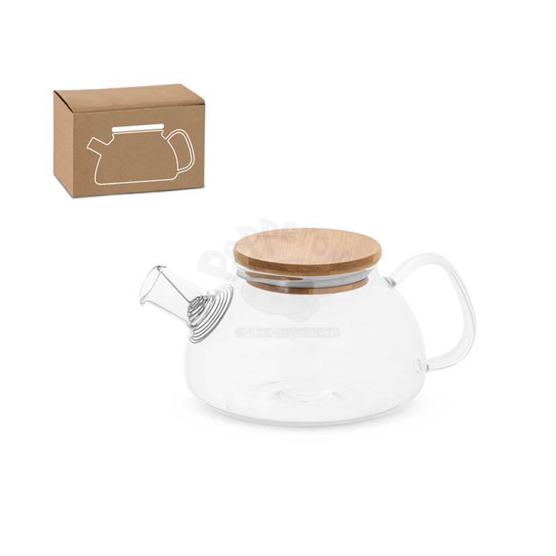 Bule de vidro borosilicato com tampa em bambu. Inclui infusor em aço inox. Capacidade até 750ml. Fornecido em caixa presente de papel craft.