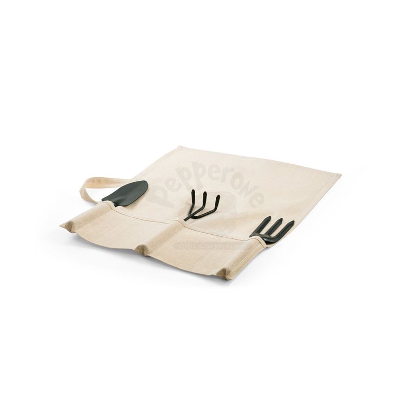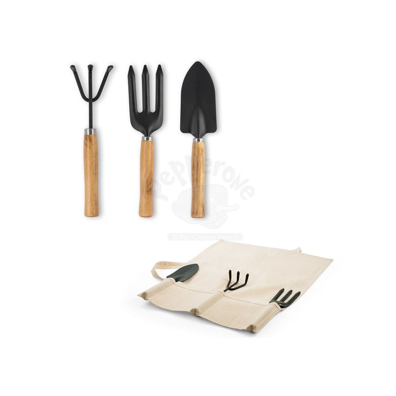 Kit jardinagem com 3 peças em metal e madeira de eucalipto, uma pá, rastelo e garfo. Inclui também uma bolsa 100% algodão com fita para fechar.