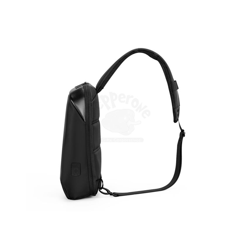 Mochila transversal com bolso interno para guardar seus itens essenciais, feito de tecido de poliéster, alça de ombro esquerdo/ombro direito reversível. Compartimento interno acolchoado para tablet, porta USB na parte inferior frontal.