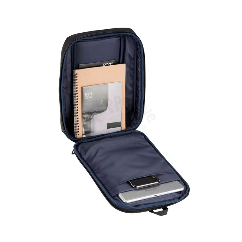 Mochila transversal com bolso interno para guardar seus itens essenciais, feito de tecido de poliéster, alça de ombro esquerdo/ombro direito reversível. Compartimento interno acolchoado para tablet.