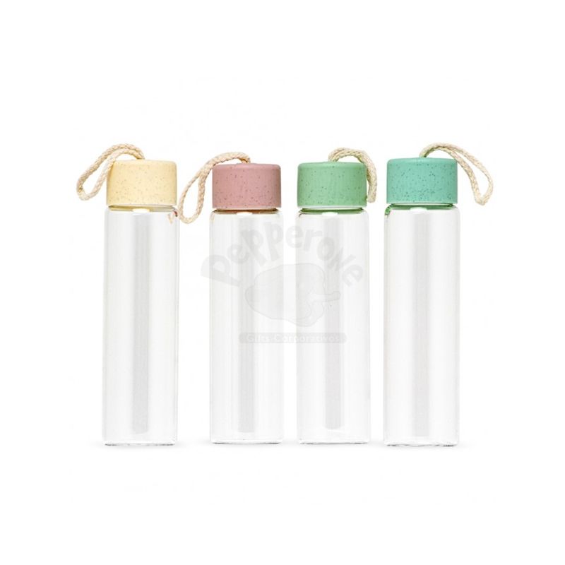 Garrafa personalizada com capacidade para 330ml produzida em vidro borossilicato. Possui tampa rosqueável em plástico com vedação para evitar o vazamento do líquido e alça de algodão. Ideal para divulgar sua empresa em eventos corporativos, brindes personalizados e campanhas promocionais.