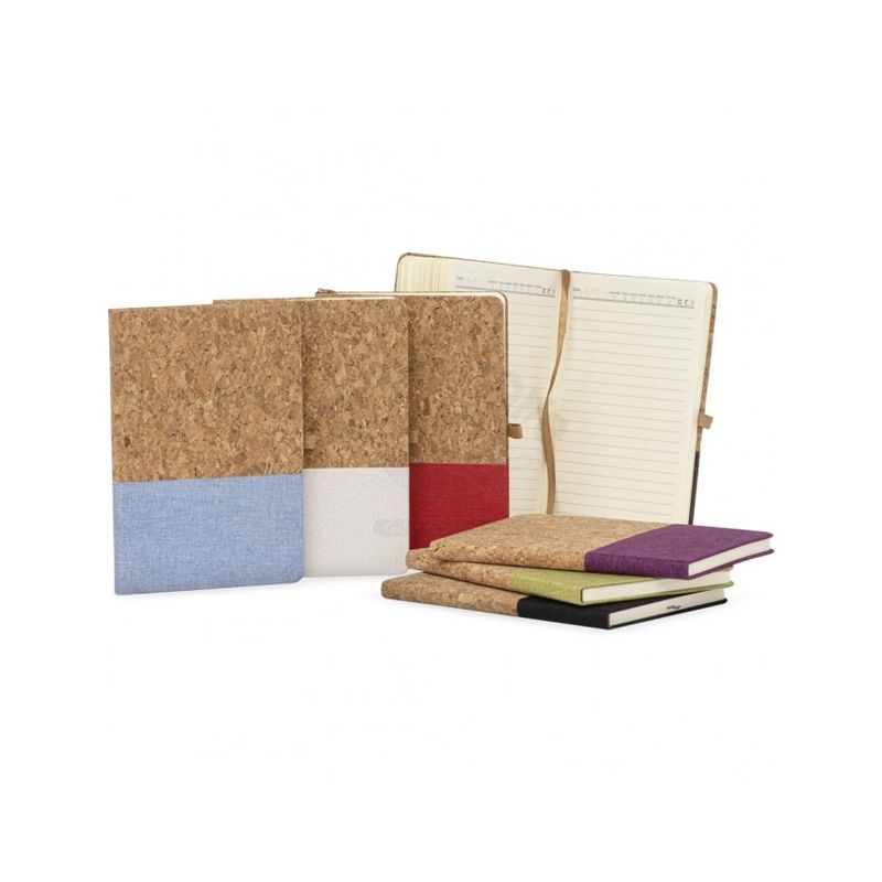 Bloco de anotações personalizado produzido cortiça com detalhe em linho, possui capa dura, marcador de página com fita de cetim, suporte para caneta, folhas pautadas, possui campo para data; dia da semana e condição climática, página para dados pessoais, calendário 2023 a 2025 e por fim, folhas para planejamento anual.