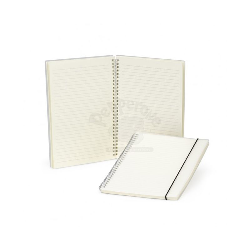 Bloco de anotação B5 com capa plástica e elástico para fechar que impede que abra acidentalmente. Contém aproximadamente 80 folhas marfim com pauta. Também conta com uma encadernação wire-ô, que garante que suas páginas não se soltem ou sejam perdidas. Ideal para divulgar sua empresa em eventos corporativos, brindes personalizados e campanhas promocionais.