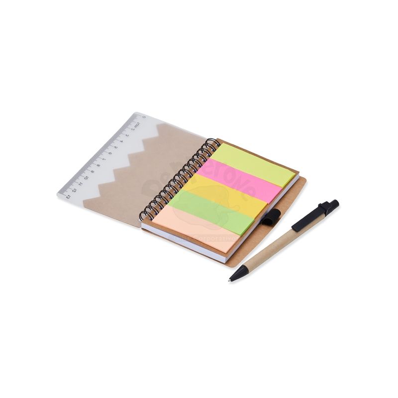 Bloco de anotações ecológico personalizado, possui autoadesivos, régua e caneta. Seu material é em kraft. Contém folha com de régua 13 cm, cinco autoadesivos com aproximadamente 13 folhas, bloco com aproximadamente 69 folhas brancas com pauta, porta caneta elástico e acompanha caneta de papelão com detalhes plásticos, carga esferográfica azul 1.0mm e acionamento por clique. Ideal para divulgar sua empresa em eventos corporativos, brindes personalizados e campanhas promocionais.