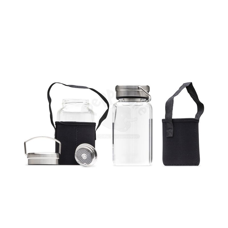Garrafa de vidro personalizada com capacidade de até 650ml para armazenar sua bebida. Produzida em vidro borossilicato, um material durável e fácil de limpar. Contém também tampa de alumínio com alça para transporte, acompanha peneira infusora e uma capa protetora de neoprene que mantem a garrafa aquecida por mais tempo, a capa possui uma alça que facilita o transporte. Ideal para divulgar sua empresa em eventos corporativos, brindes personalizados e campanhas promocionais.