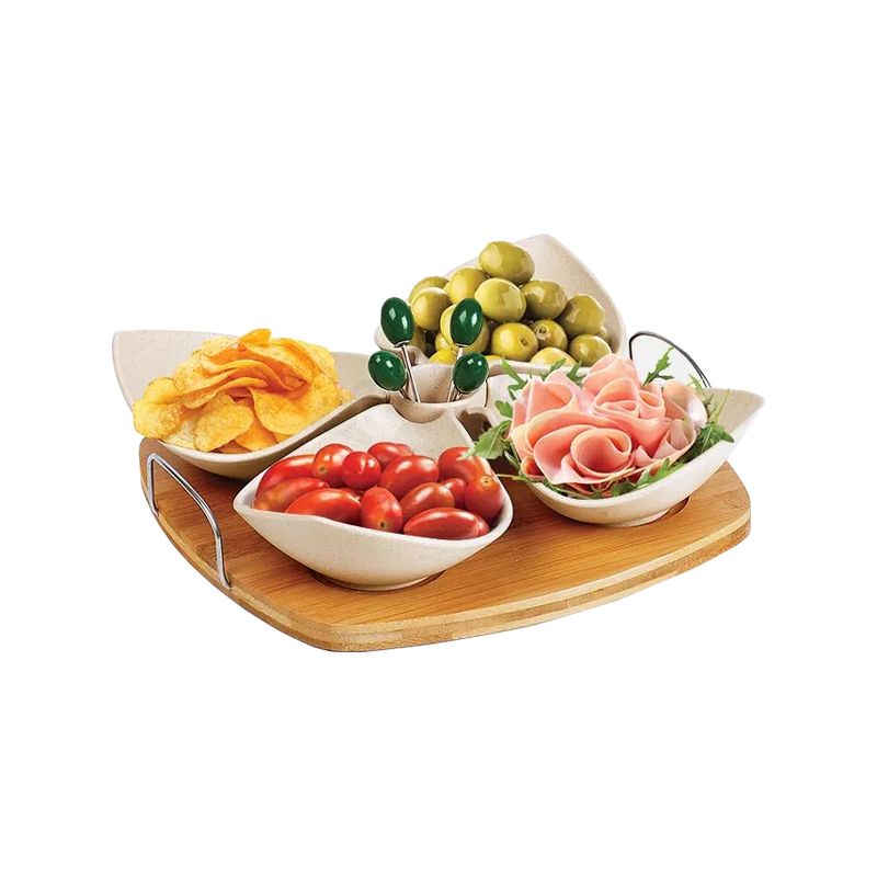 Kit Petisco com 10 peças personalizadas. Conjunto para petisco em bambu/fibra de bambu, acompanha cinco potes em fibra de bambu, quatro garfos em aço inox com ponta em formato de azeitona e base em bambu com alças em aço inoxidável. Ideal para sua campanha de endomarketing ou premiação de colaboradores. Imagem meramente ilustrativa.