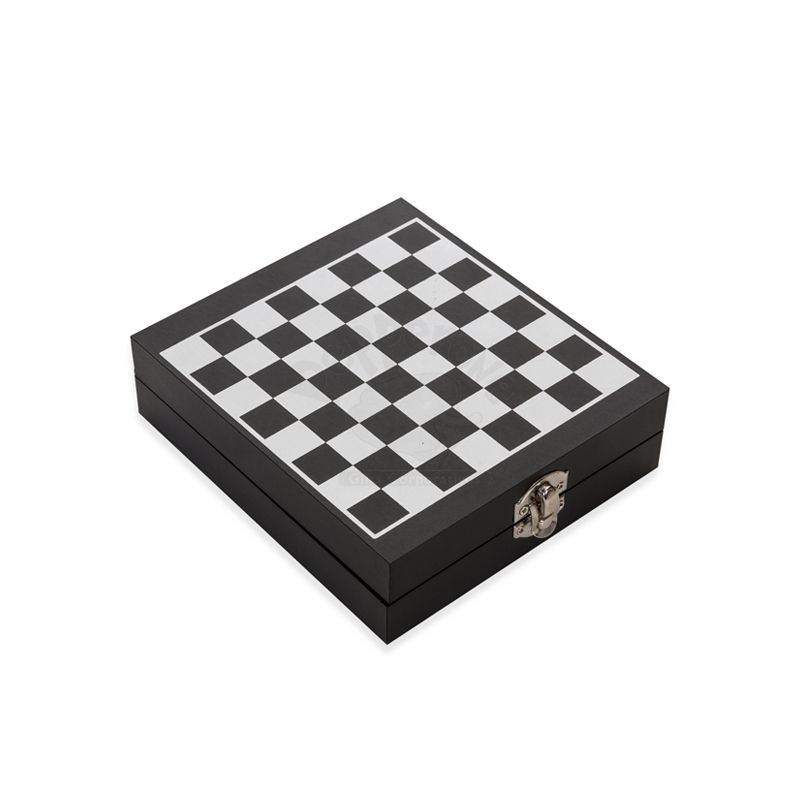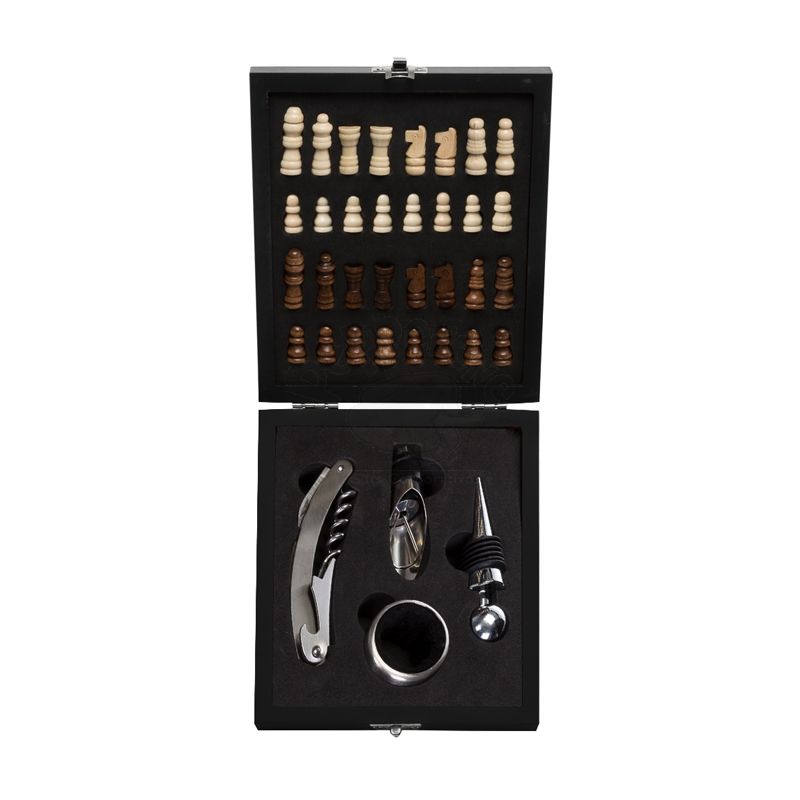 Kit vinho xadrez 4 peças personalizadas. No estojo tabuleiro de xadrez contém um wine collar, tampa de bico, bico condutor com tampa e saca rolhas metálico com lâmina de corte e abridor de garrafa. Estojo possui uma trava de segurança e área interna com berço de espuma, acompanham 32 peças de xadrez e plaquinha metálica para personalização.