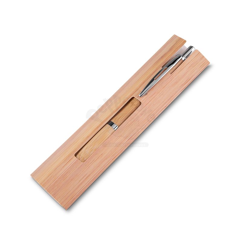 Caneta ecológica personalizada produzida em bambu com clip e detalhes em metal, possui esferográfica azul e acionamento da escrita por click. Produto inovador visando campanhas que defendem um mundo mais sustentável. Acompanha estojo de papel impresso com imitação em bambu. Ideal para divulgar sua empresa em eventos corporativos, brindes personalizados e campanhas promocionais.