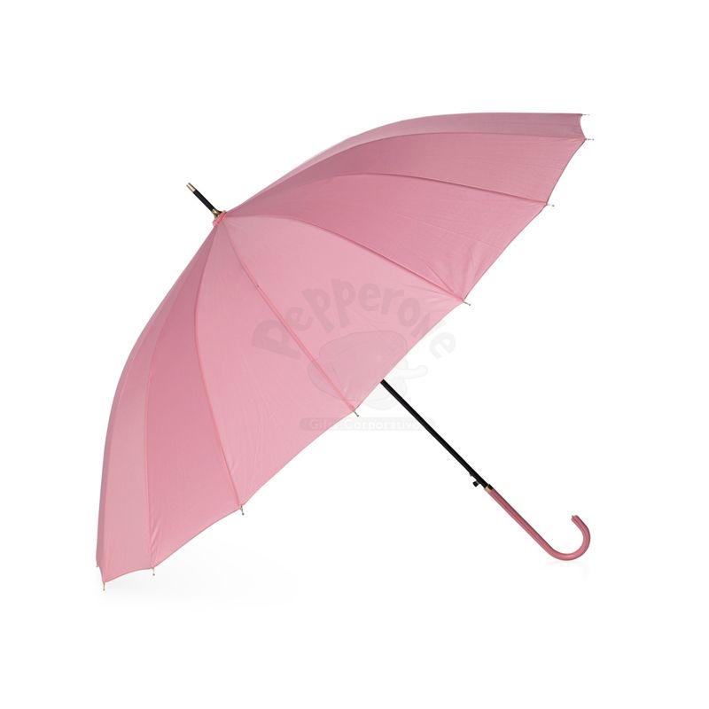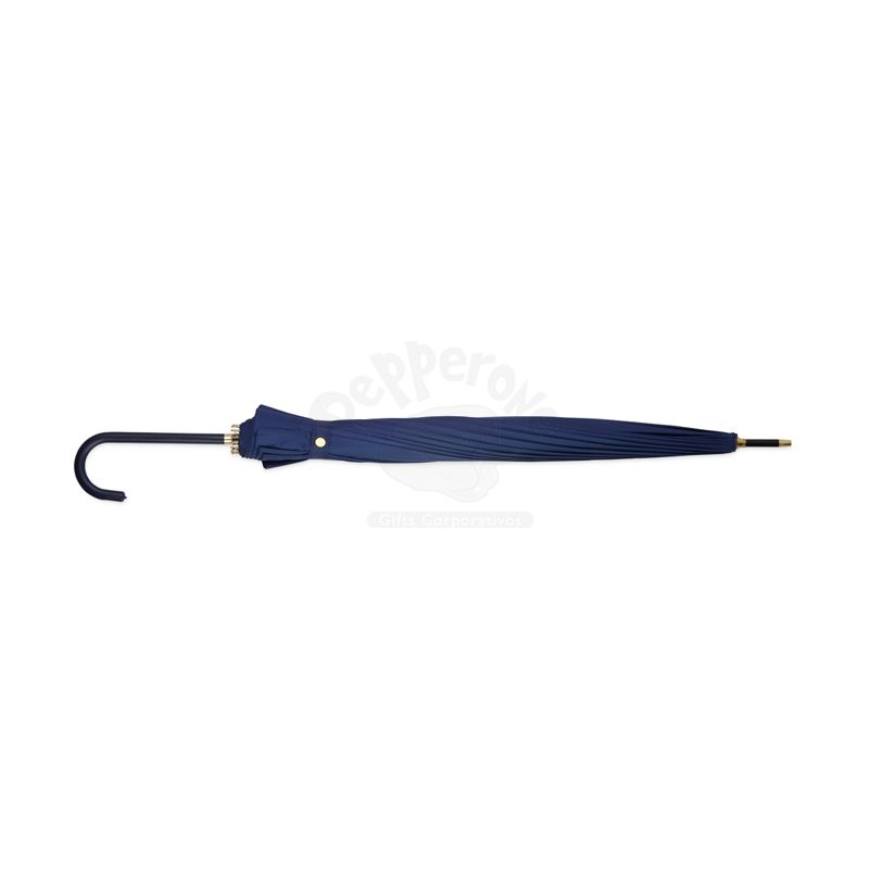 Guarda-chuva de poliéster de impacto impermeável com abertura automática, estrutura em aço e 16 varetas em fibra de vidro. Possui pegador em couro sintético com botão de acionamento.
