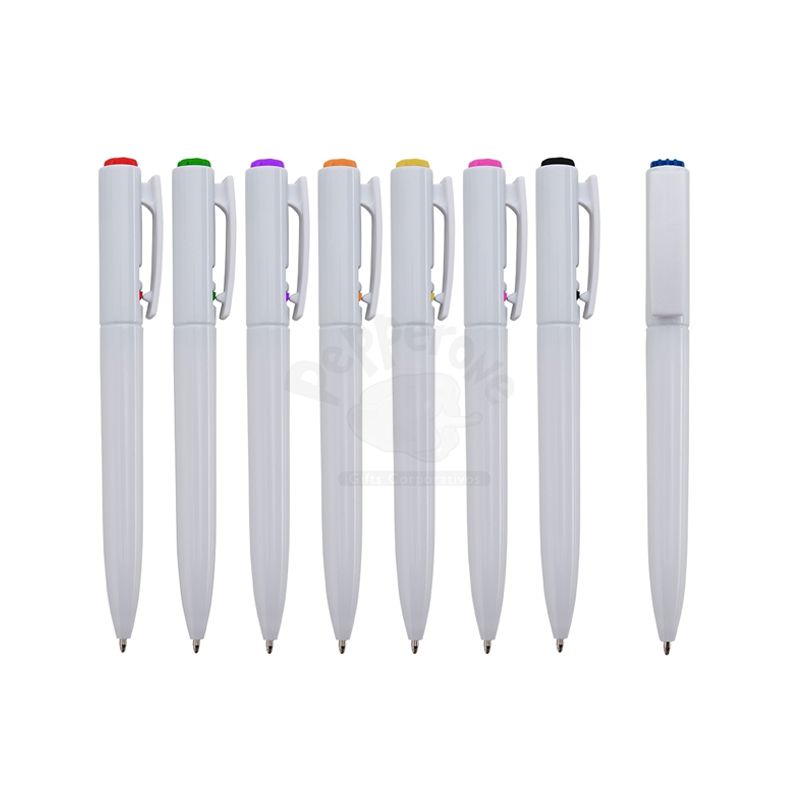 Caneta personalizada produzida em branco com detalhes coloridos. Possui botão de acionamento na ponteira superior e bloqueia através do clip lateral. e esferográfica com a escrita na cor azul . Ideal para brindes promocionais, campanhas e eventos corporativos.