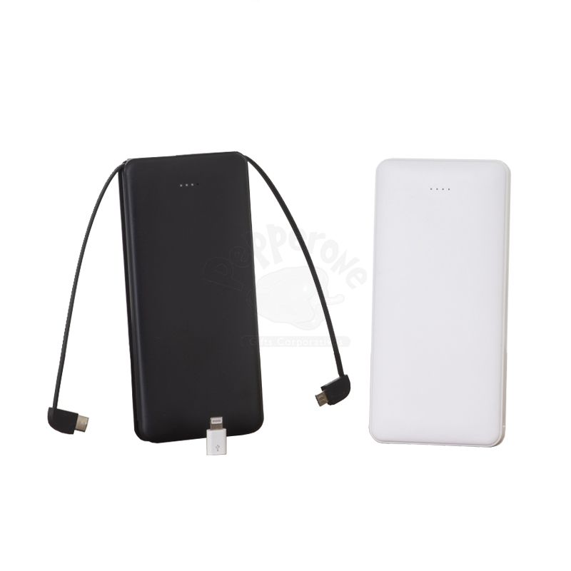 Power bank plástico de 10.000mAh com indicadores led de bateria e cabos acoplados, tipo-C e V8. Acompanha cabo USB V8 e adaptador Lightning. Ideal para divulgar sua empresa em eventos corporativos, brindes personalizados e campanhas promocionais.