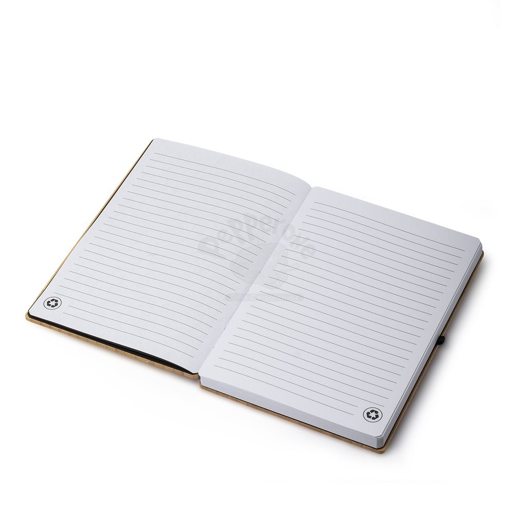 Caderno de anotações com elástico e suporte para caneta, capa dura com 3mm em material reciclável imitando bambu , miolo com 96 folhas pautadas na cor branca. Não acompanha caneta.