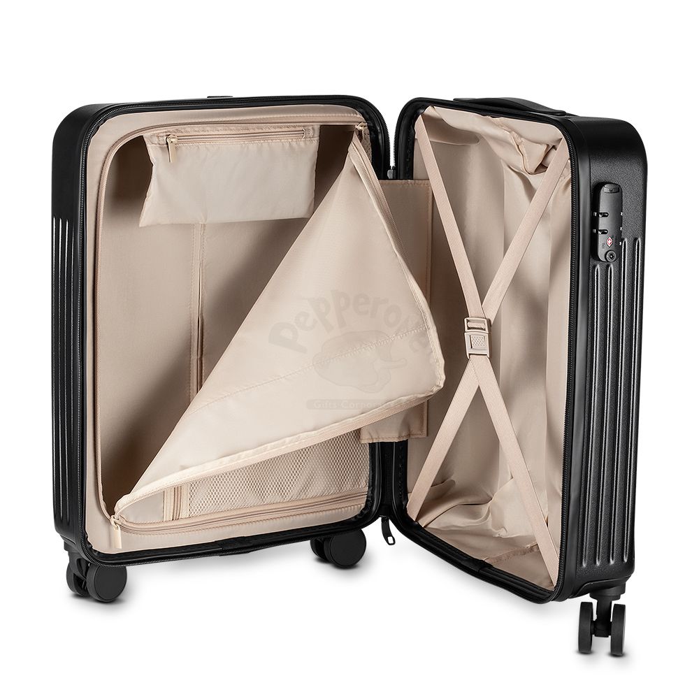 Mala de viagem em ABS Abertura frontal com ziper para acesso ao interior da mala; Saida USB ideal para carregamento de smartphones; Sistema de carrinho de aço; Alça de mão na parte superior Quatro rodas de 360 graus; Acompanha Plaquinha de acrílico auto colante.