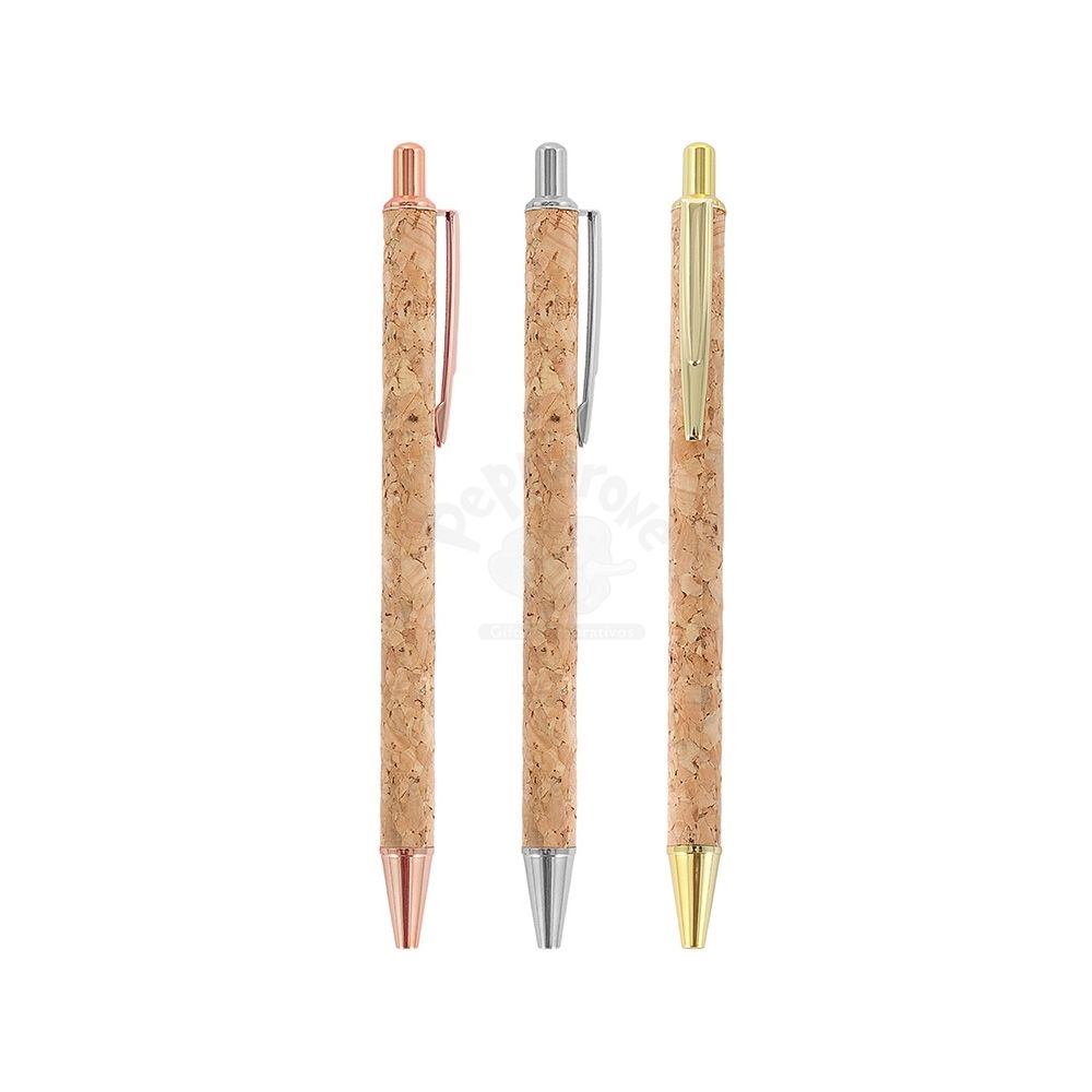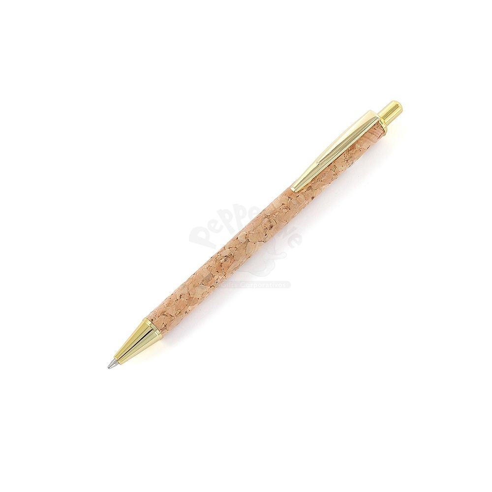 Caneta de cortiça com carga esferográfica azul 1.0mm e acionamento por clique. Clipe metálico, acionador e ponteira plástica.