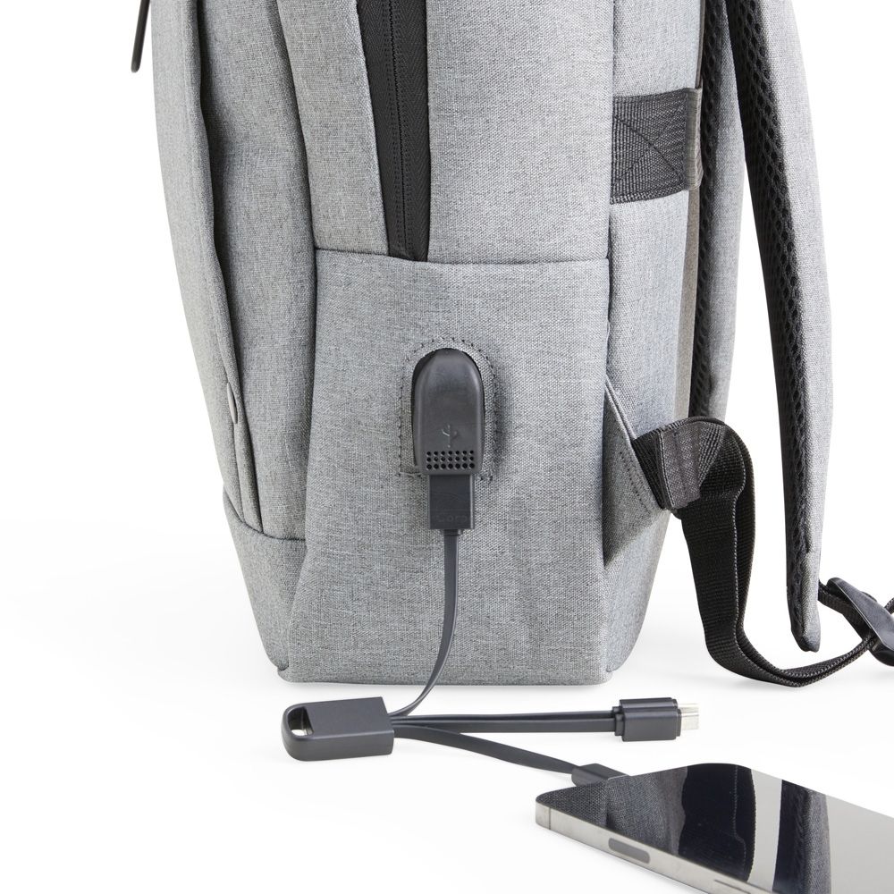 Mochila de nylon 21 Litros com dois compartimentos, sendo o principal com bolso para notebook 15,6. Com divisórias internas para acessórios, a mochila possui bolso lateral, suporte externo USB e alça para engate em malas de viagem.