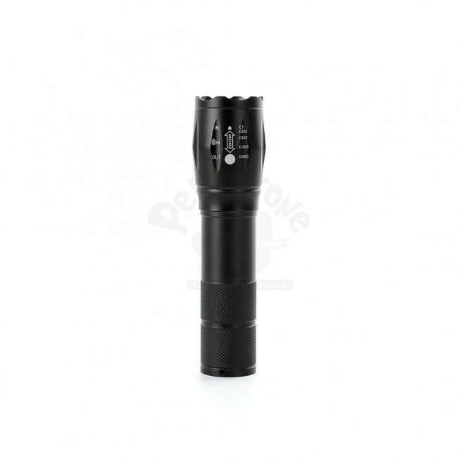 Lanterna led recarregável com zoom de regulagem e três estágios de iluminação, material metálico. Acompanha cordão de nylon e cabo USB-V8.