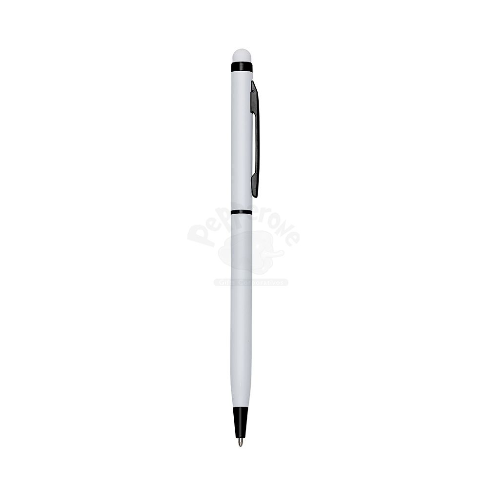 Caneta metálica com touch screen, carga esferográfica azul e acionamento por rotação.
