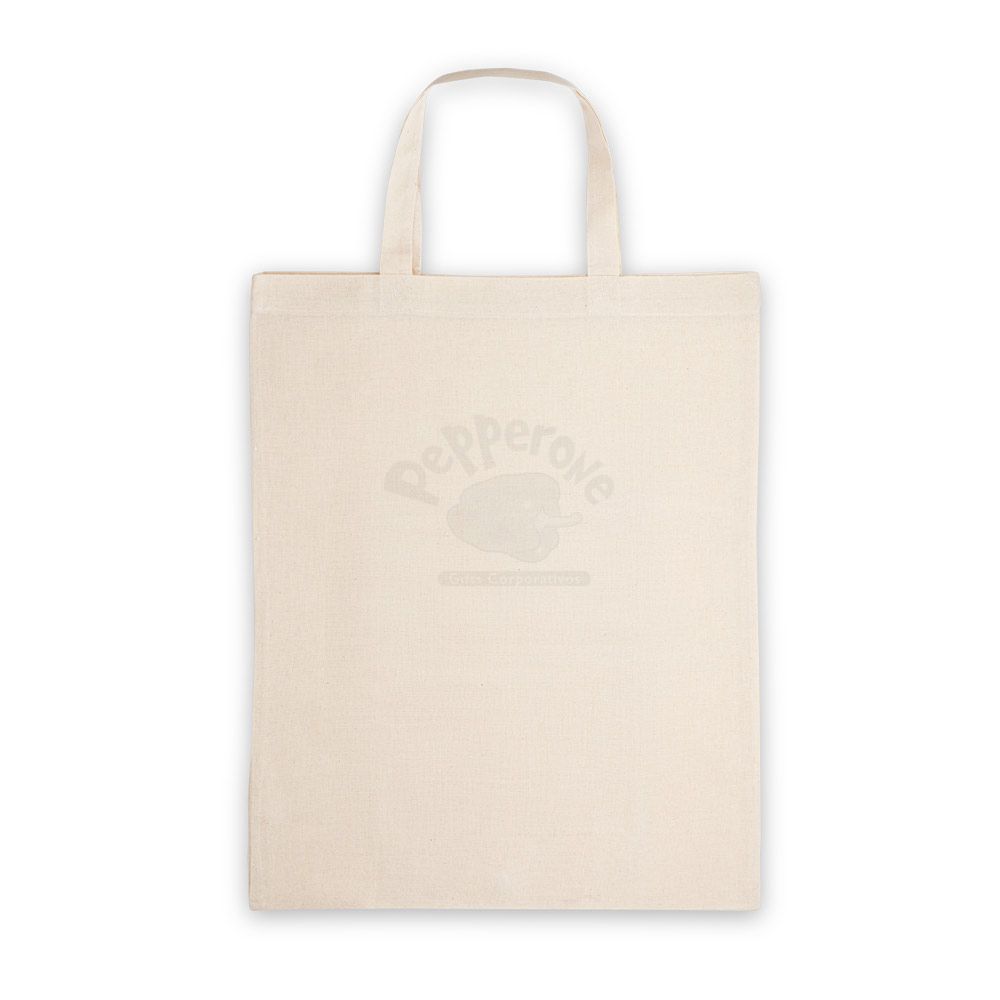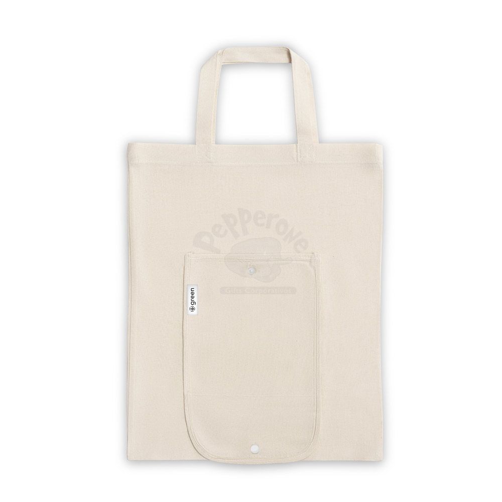 Sacola dobrável em algodão (140 g/m²) composta por 50% algodão e 50% algodão reciclado, com alças de 38 cm.