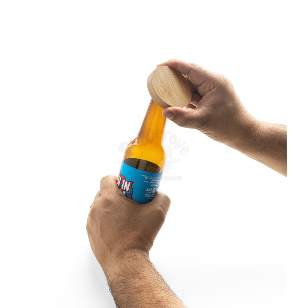 Porta copos em bambu com abridor e imã para fixar em superfícies.