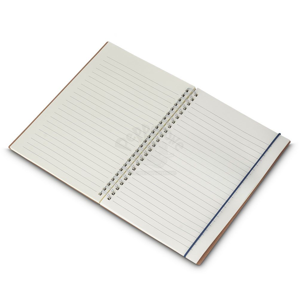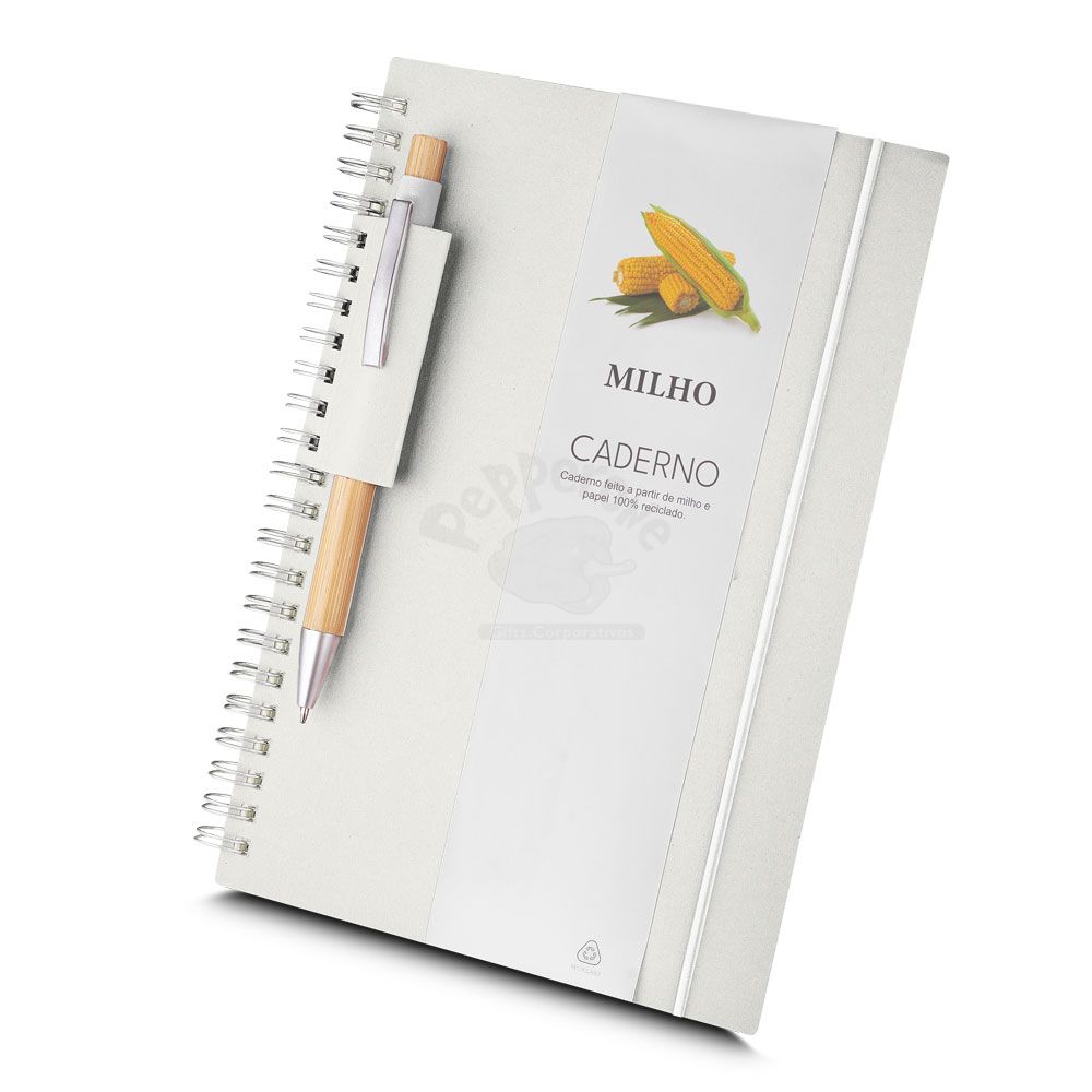 Caderno de anotações 21x15cm, capa em papel 100% reciclado com elástico, contendo: Miolo de 70 folhas pautadas na cor bege; Com suporte para caneta em papel reciclável;