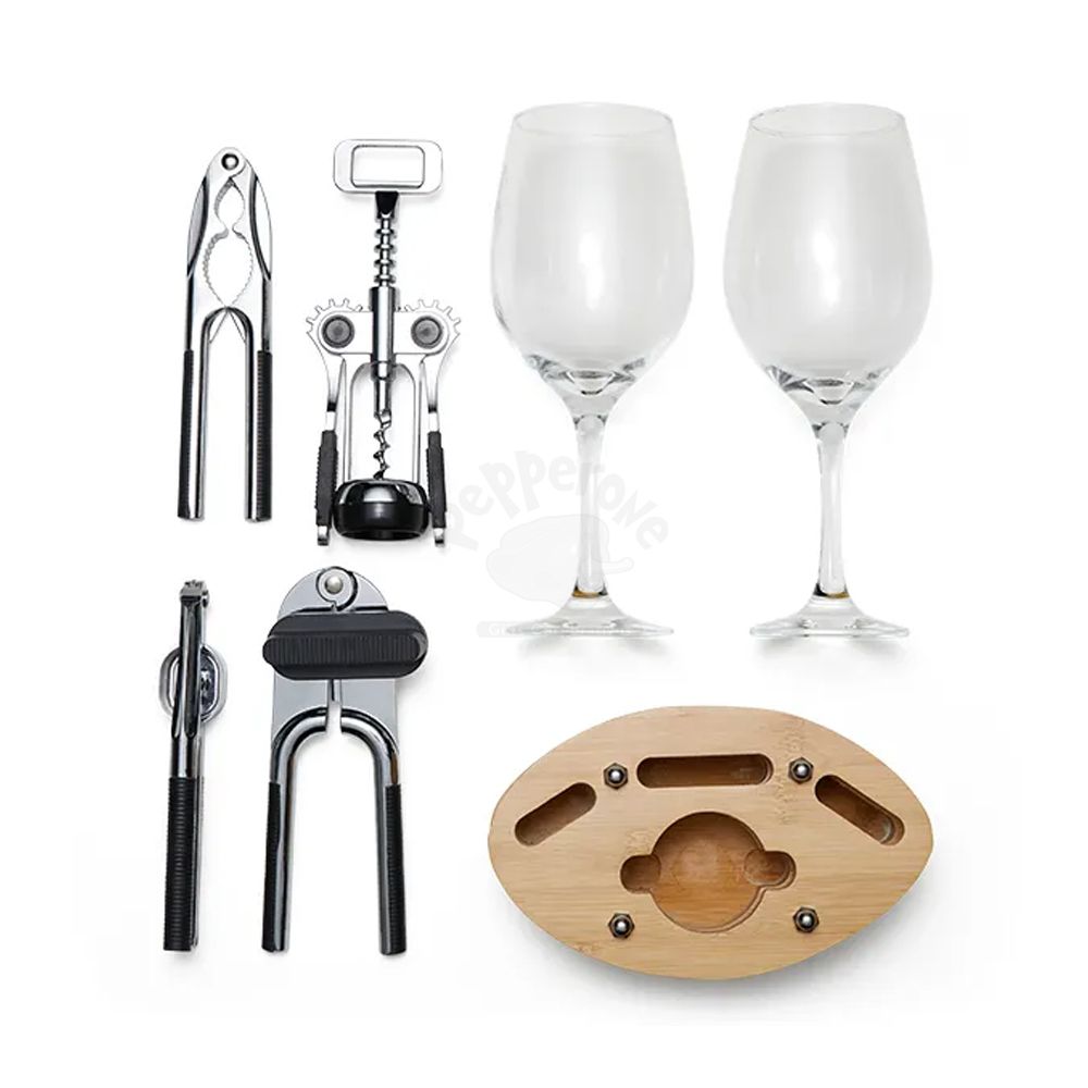 Kit com quatro acessórios úteis para cozinha em metal cromado brilhante com detalhes em plástico texturizado preto nos cabos, sendo um abridor de latas borboleta, um espremedor de alhos, um alicate quebra-nozes, um saca-rolhas de alavanca dupla com espiral e taças de 490 ml para vinho.