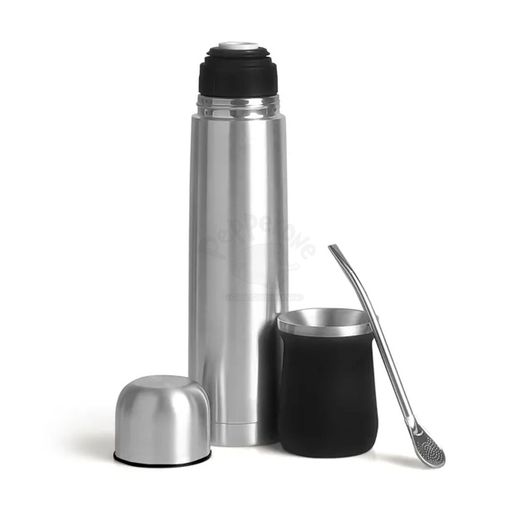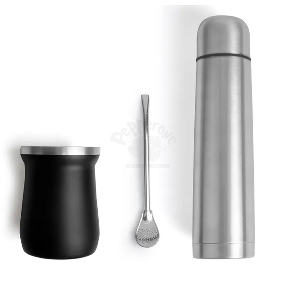 Kit para chimarrão / tereré. Conta com cuia e garrafa térmica em Aço Inox; bomba para chimarrão / tereré; bolsa para a garrafa em material sintético com alça. Cuia confeccionada com dupla parede de inox 250ml. Garrafa com tampa e tampa click 1L. Os dois contam com dupla parede de inox, isoladas a vácuo.