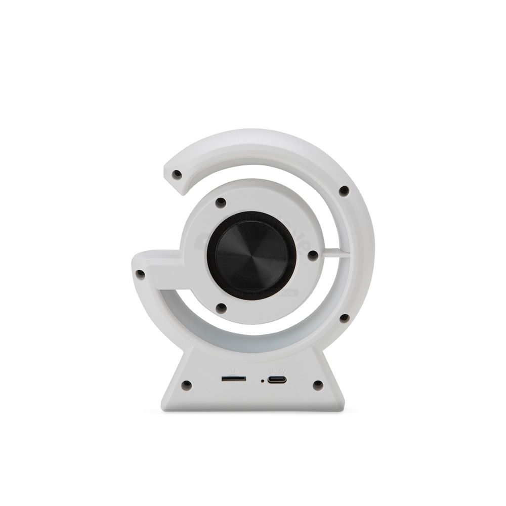 Caixa de som com luminária. Possui 8 modos de iluminação, opera nos modos bluetooth, rádio FM e TF (cartão MicroSD).