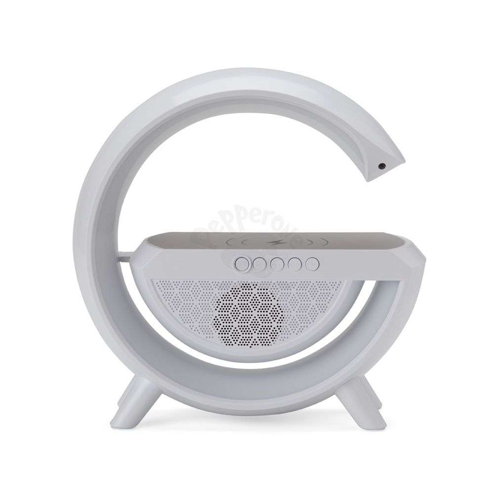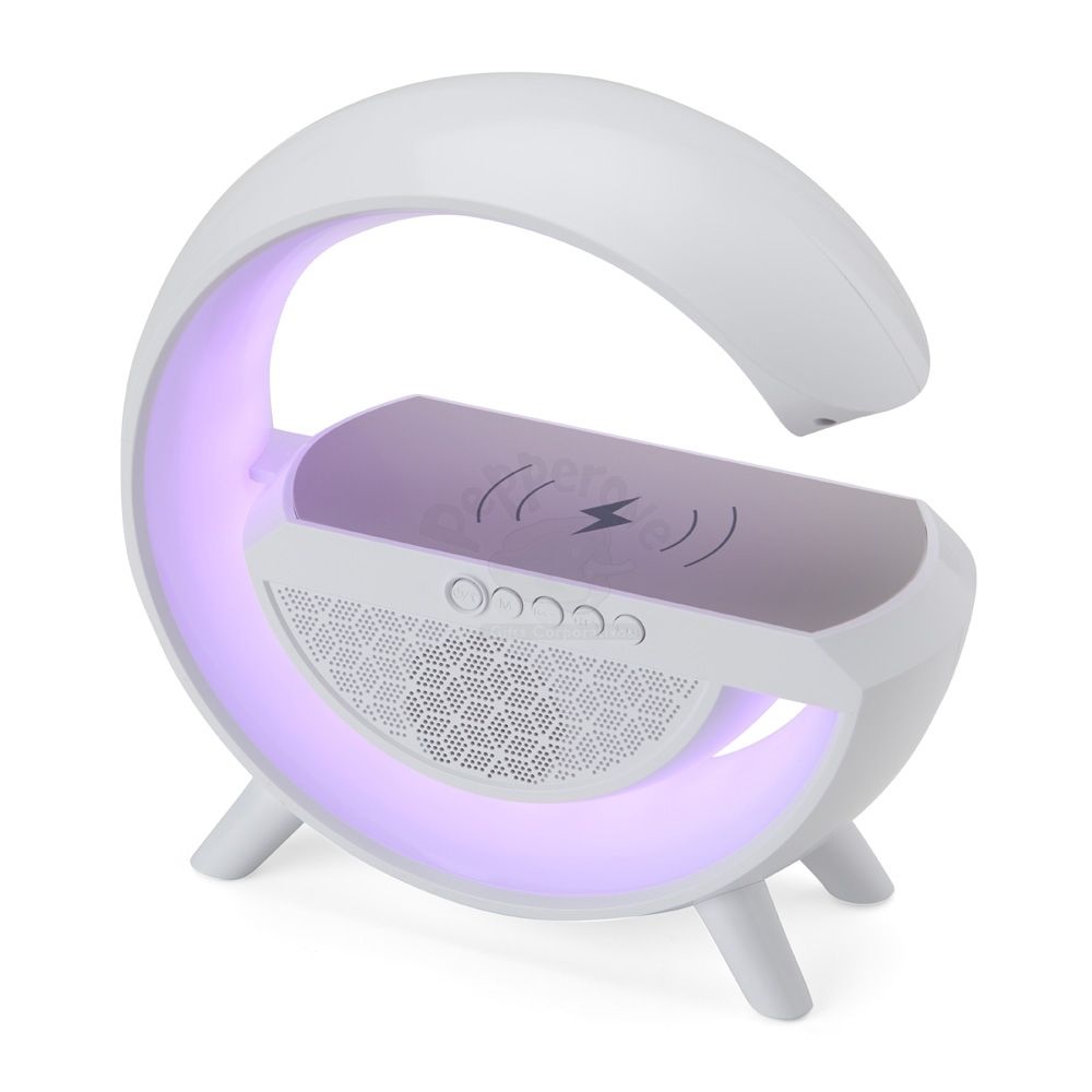 Caixa de som com carregador por indução e luminária. Possui 6 modos de iluminação, opera nos modos bluetooth, rádio FM, auxiliar P2, USB e TF (cartão MicroSD). Para desfrutar do carregamento por indução (sem fio) é fundamental que o celular possua a tecnologia QI, o produto só armazena bateria para funcionamento próprio, para funcionar a indução precisa estar conectado a uma fonte de energia.